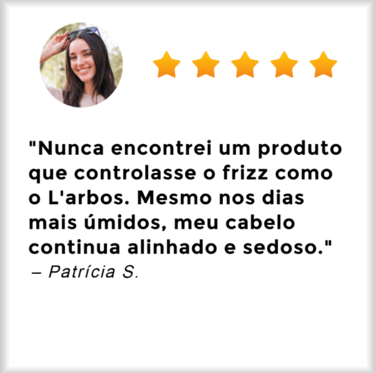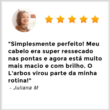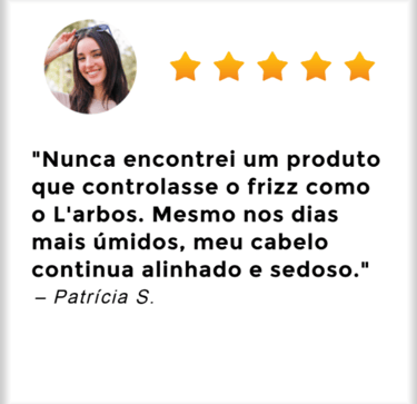 "Eu tinha insegurança quando saia na rua por conta do frizz e do meu ressecamento... Depois que comprei o L'arbos ando com confiança, pois agora meu cabelo está sempre muito bem hidratado e fortalecido!"